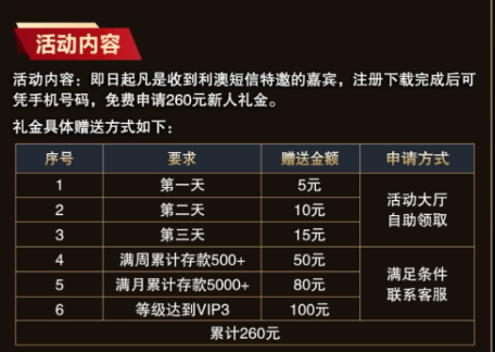 活动详情:新用户注册绑卡,完善信息,优惠大厅自助申请彩金,特邀碰瓷,第一天5,第二天10,第三天15,具体自测!