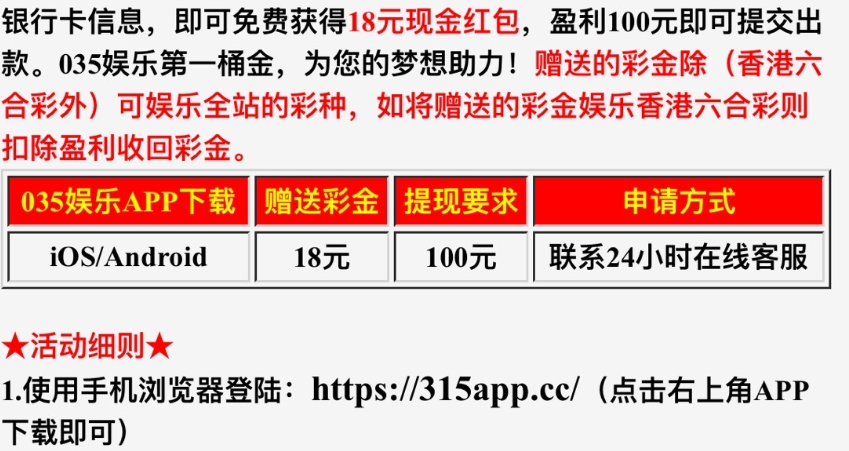 活动详情:新用户注册绑卡下载APP找客服申请开户彩金送18满100即可提现,IP不是特别严格